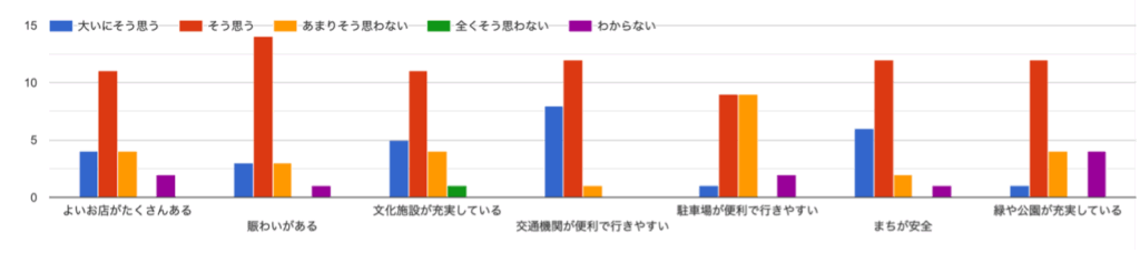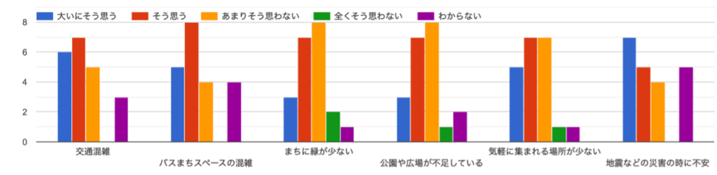一方で、街の問題については、「交通混雑」「バス待ちスペースの混雑」「気軽に集まれる場所が少ない」「地震などの災害の時に不安」という質問に対して、「大いにそう思う」と考えている人の割合が高い。